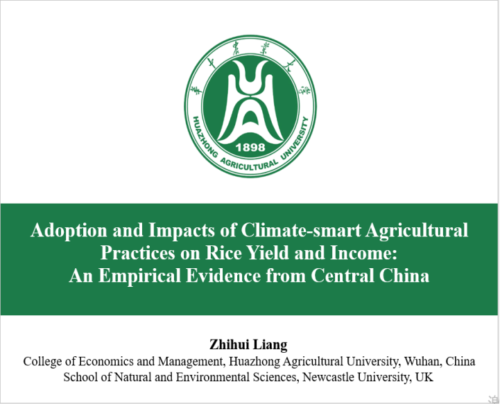 梁志会在Food Security and Climate Around the World分会场作了题为“Adoption and Impacts of Climate-smart Agricultural Practices on Rice Yield and Income: An Empirical Evidence from Central China”的汇报。论文分析了中国中部地区农户气候智慧型农业措施采纳决策及其对水稻产量和净收入的影响,对适应型和减排型气候智慧型农业技术措施的协同效应进行了有益的补充。
